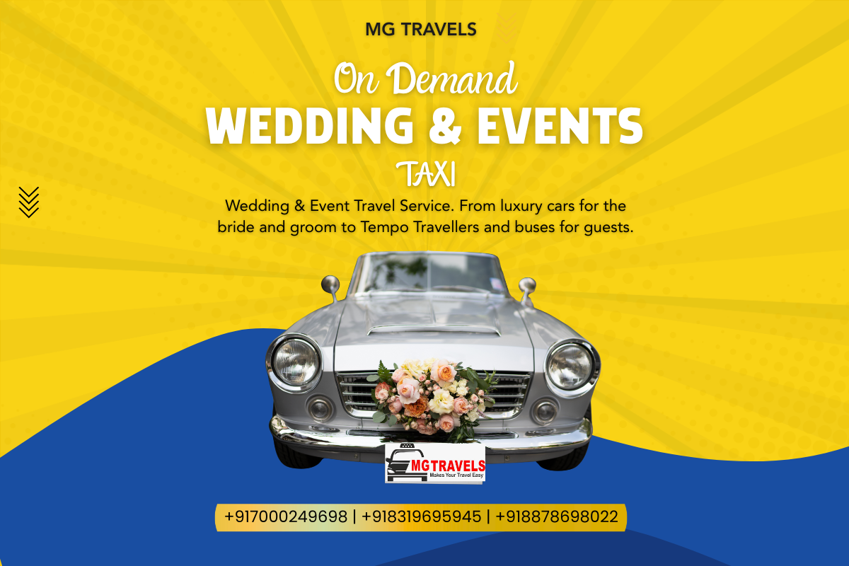 MG Travels Wedding & Event Travel Service. From luxury cars for the bride and groom to Tempo Travellers and buses for guests — we provide comfortable and elegant travel solutions for weddings, parties, and celebrations.